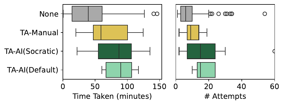 Fig. 3b from the paper. Time taken and number of attempts across groups. TA-Manual students completed the harder question faster with fewer attempts than AI-augmented groups
