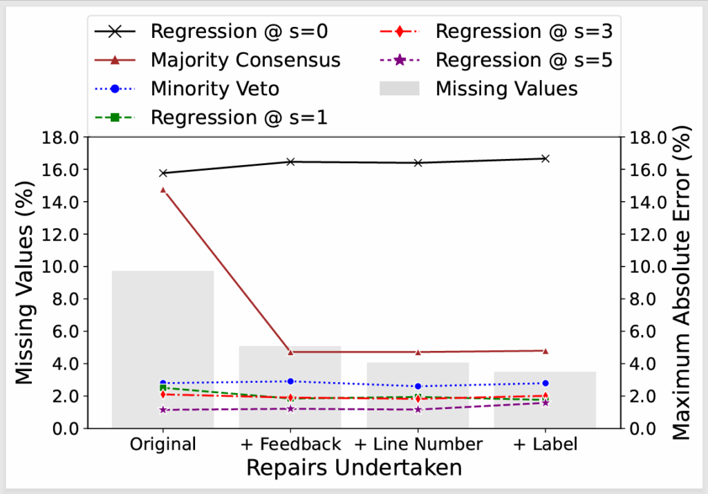 Mean of the Maximum Absolute Error (MAE) for different approaches across data repair strategies